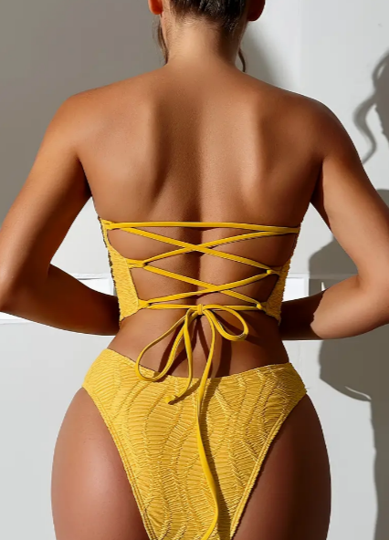 Plain Lace Up Tie Back High Cut Stretchy Swimsuit