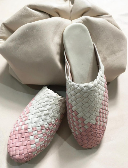 / Handwoven Lambskin Slippers White and Pink Combination
